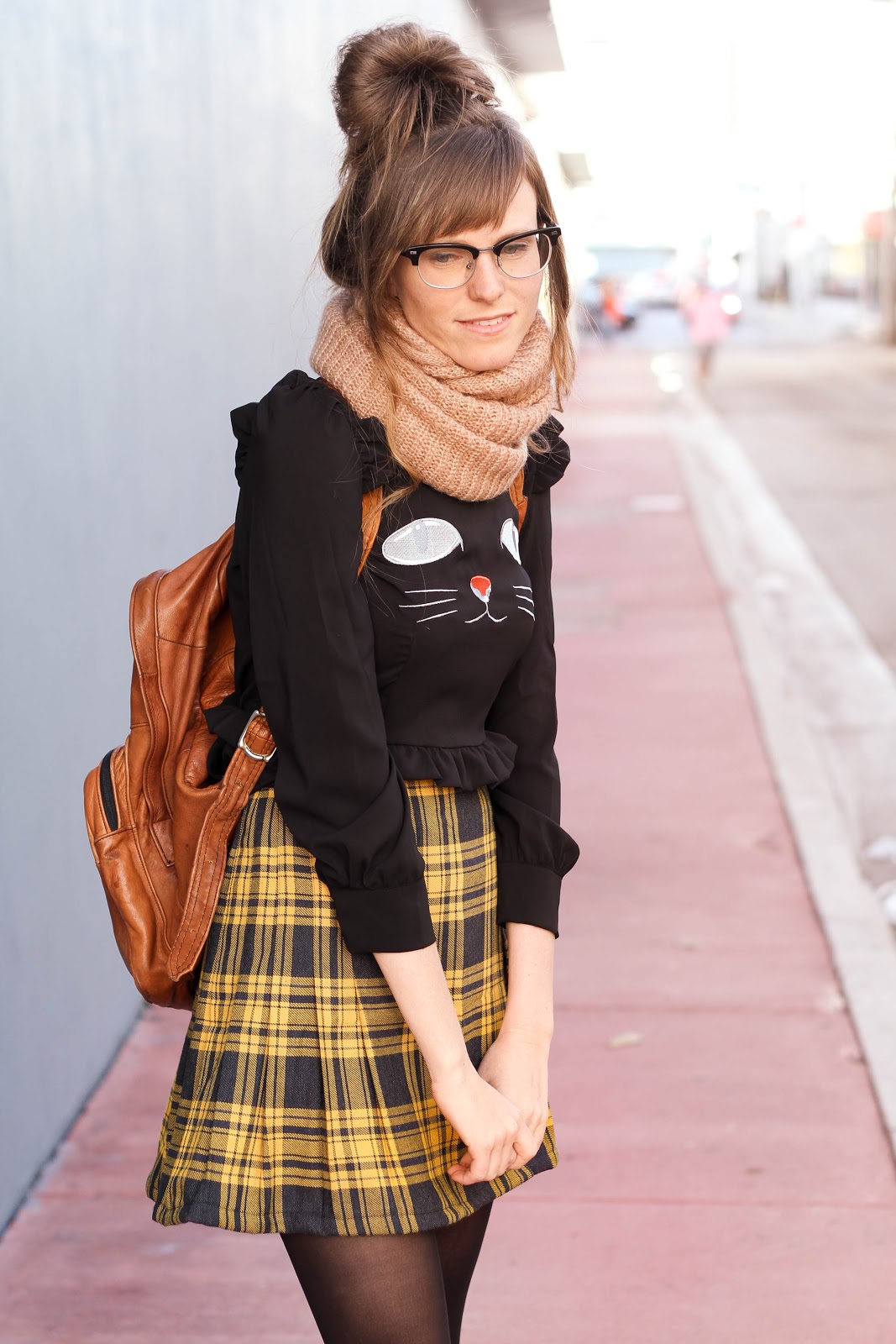 it's been in the 60's and 70's here all weekend, so i've been enjoying wearing tights, scarves and sweaters! i adore wearing plaid around the holidays, but wanted another option other than holiday colored plaid. i love opting for mustard and cobalt blue plaid instead! the kitty blouse is one of the quirkiest tops i own :) it's so lovely to be able to complete an outfit with a scarf, what a nice treat for me! i hope you all have a beautiful holiday tonight and tomorrow. ❤