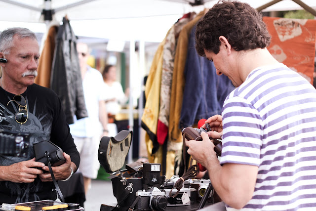every other sunday on lincoln road, there is an amazing antique fair with an endless amount of booths lining the streets. many of them are overpriced, but that doesn't mean a gal can't browse and dream of owning multiple closets filled with furs, vintage dresses and polka dotted silk scarves. luckily there's old cameras too, so matt came along for the walk (and claude too!)